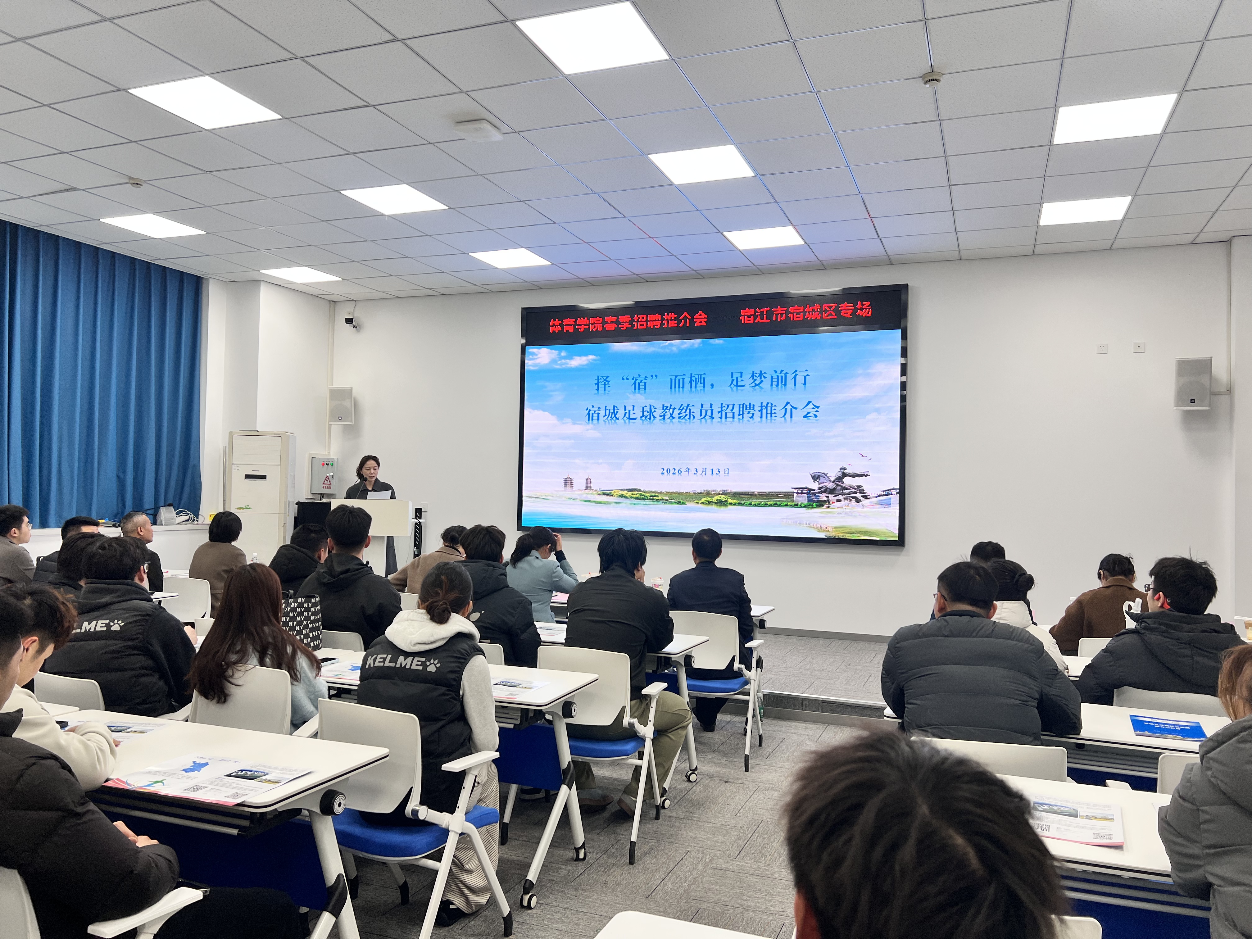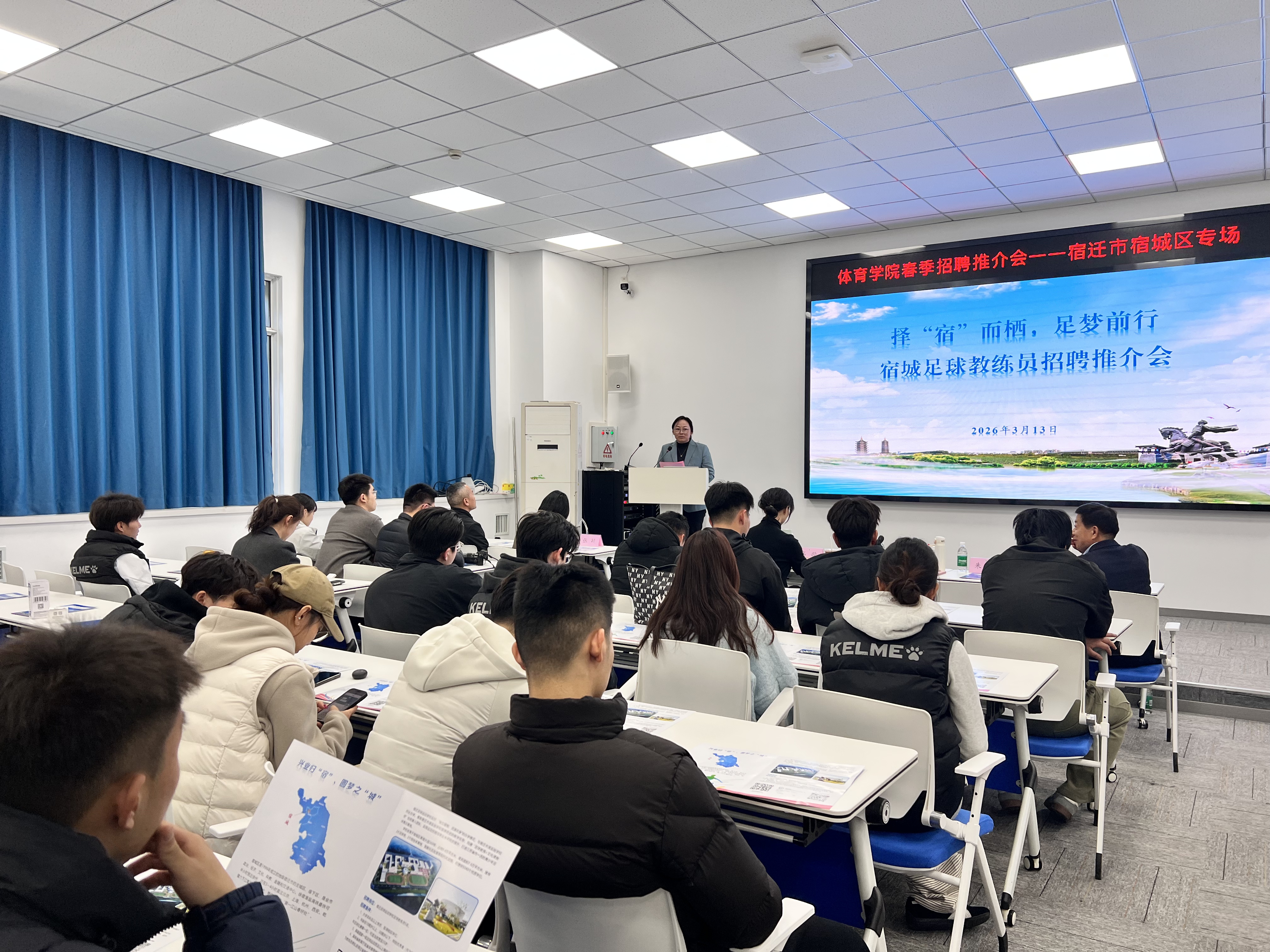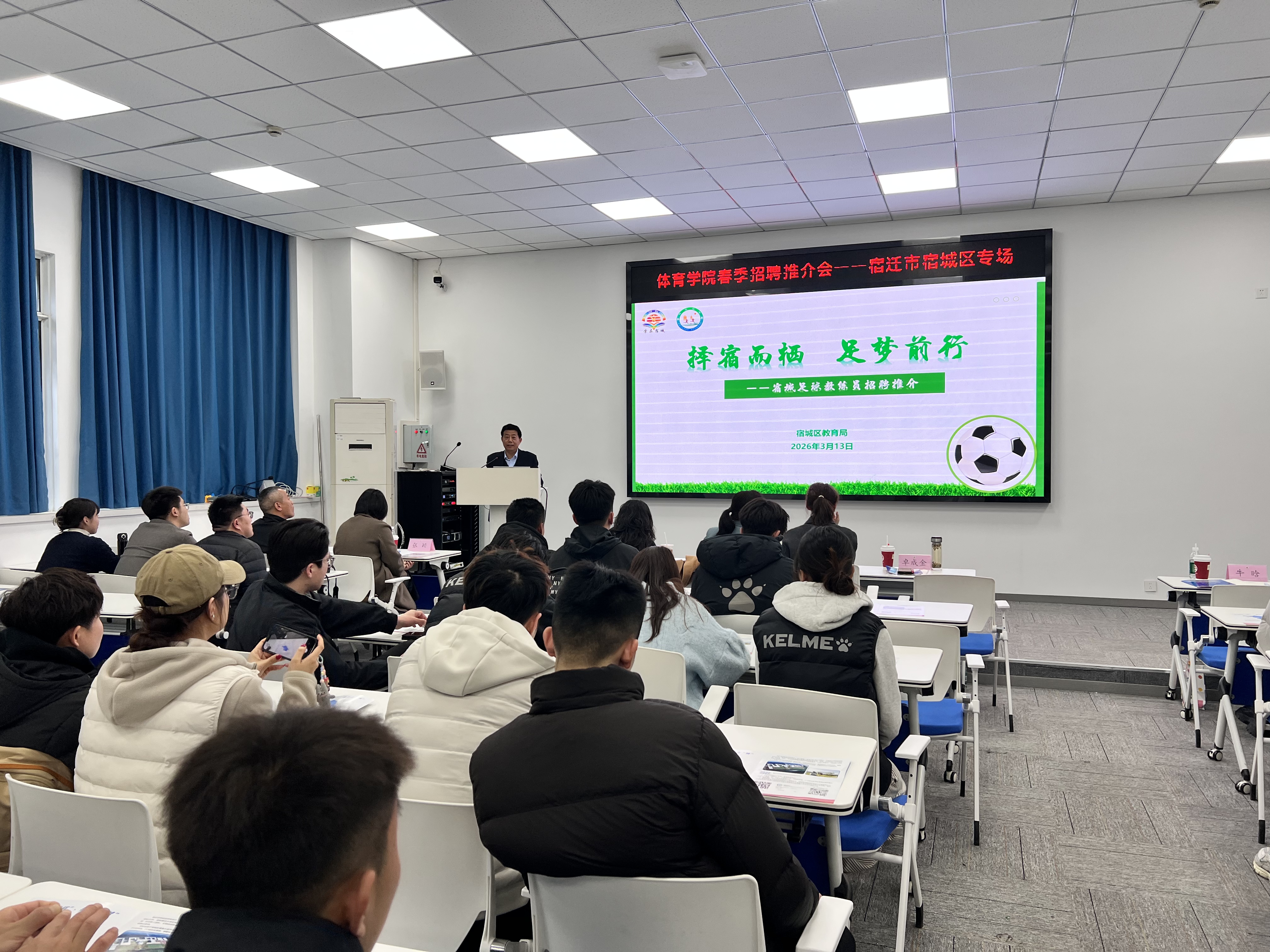 为深入贯彻落实学校2026届毕业生就业工作部署,扎实做好毕业生就业服务,搭建学生与用人单位精准对接桥梁,3月13日,体育学院2026年春季招聘推介会——宿迁市宿城区专场在学院多媒体(一)会议室成功举行。宿城区人民政府副区长秦振华率队莅临学院开展宣讲,体育学院党委副书记朱悦主持活动,学院就业辅导员王广嘉,以及2026届毕业生、低年级学生代表参会。